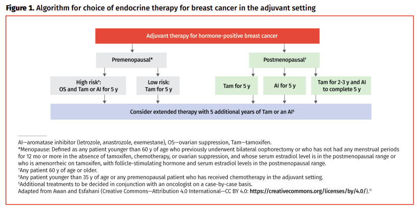 Se ha publicado una breve revisión sobre las terapias endocrinas para el cáncer de mama y próstata, que son tratamientos fundamentales para mejorar la supervivencia y disminuir el riesgo de recurrencia pero que, debido a sus efectos adversos, dificultan una adherencia óptima. Existen algunos tipos de cáncer que utilizan vías de señalización hormonal para su crecimiento y concretamente el de mama y próstata requieren hormonas femeninas y masculinas, respectivamente. La terapia endocrina actúa interfiriendo dicha señalización y, en consecuencia, evita la proliferación del cáncer. El tipo y duración de la terapia endocrina depende de múltiples factores: estadio del cáncer en el momento del diagnóstico, indicadores de pronóstico, genómica del cáncer, resistencia endocrina y tolerancia a los efectos adversos. En el cáncer de mama, más del 75% son hormonodependientes, ya que están medidados por receptores positivos de hormonas (estrógeno o progesterona). Las principales terapias endocrinas adyuvantes son: La elección de estas terapias depende principalmente de que la paciente sea premenopáusica o postmenopáusica; y la duración suele ser de 5 años, aunque puede prolongarse hasta 10 años, a criterio del oncólogo. Los efectos adversos (sofocos, artralgias, osteoporosis, entre otros) inducen falta de adherencia y suspensión del tratamiento en el 30% de los casos. En cuanto al cáncer de próstata, el 75% se diagnostican en etapa temprana, y la terapia de deprivación de andrógenos es un tratamiento fundamental, que puede lograrse con: La duración de la deprivación androgénica suele ser de 4 a 6 meses para pacientes con enfermedad de riesgo intermedio; mientras que aquellos con riesgo más alto reciben terapia continua para reducir el riesgo de recurrencia. Estas terapias se asocian a efectos adversos frecuentemente debilitantes que afectan negativamente a la calidad de vida (disminución de salud ósea, función sexual y salud mental), pudiendo provocar enfermedades cardiovasculares e inducir trastornos metabólicos, por lo que es fundamental un enfoque multidisciplinar que incluya la colaboración entre los médicos especialistas y la atención primaria. A continuación, se reproduce un algoritmo para la elección de terapia endocrina adyuvante para el cáncer de mama, así como una tabla de los tratamientos para cáncer de próstata.